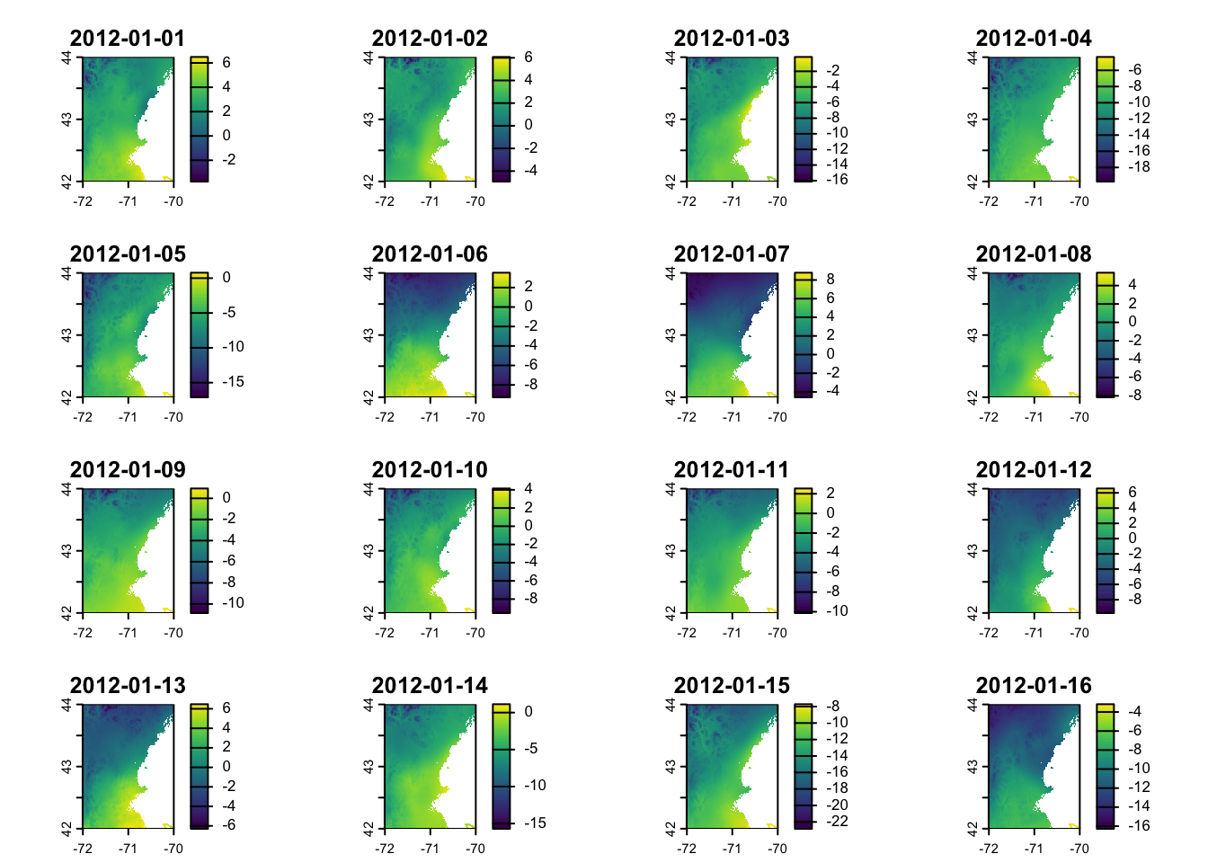names(mean_layer) <- gsub("tmax","tmean",names(mean_layer))This results in a raster containing a single variable ‘tmean’ for each day: