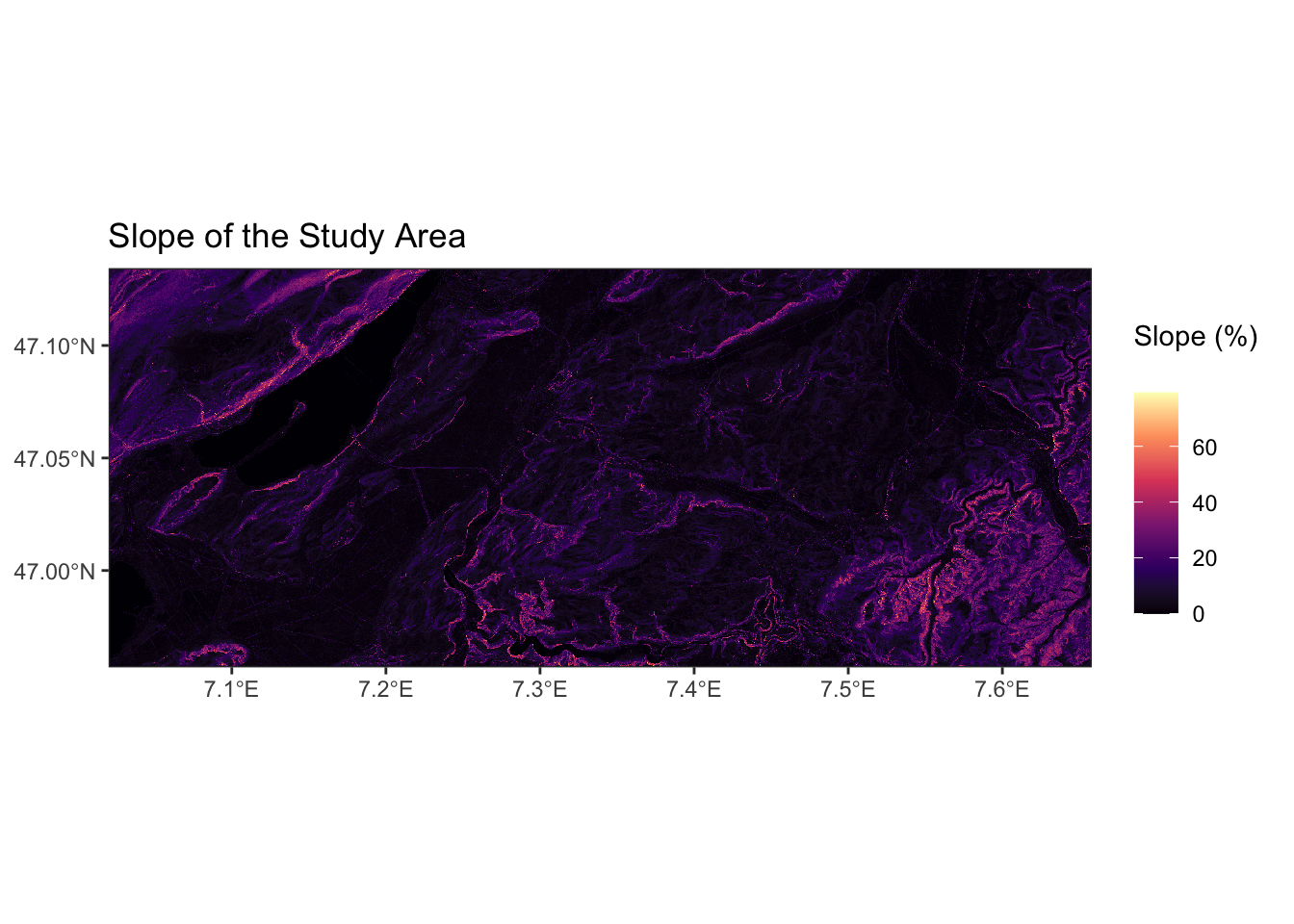 That looks great! At a first glance, it is a bit crowded but once you zoom in, you can investigate our study area quite nicely. You can check whether the slope raster file makes sense by comparing it against the base maps. Can you see how cliffs along the Aare river, hills, and even gravel quarries show high slope values. We also see that our testing dataset is randomly distributed across the area covered by the training dataset.
