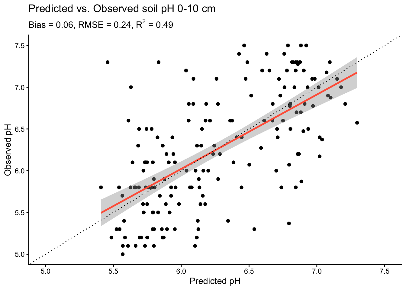 title = "Predicted vs. Observed soil pH 0-10 cm",